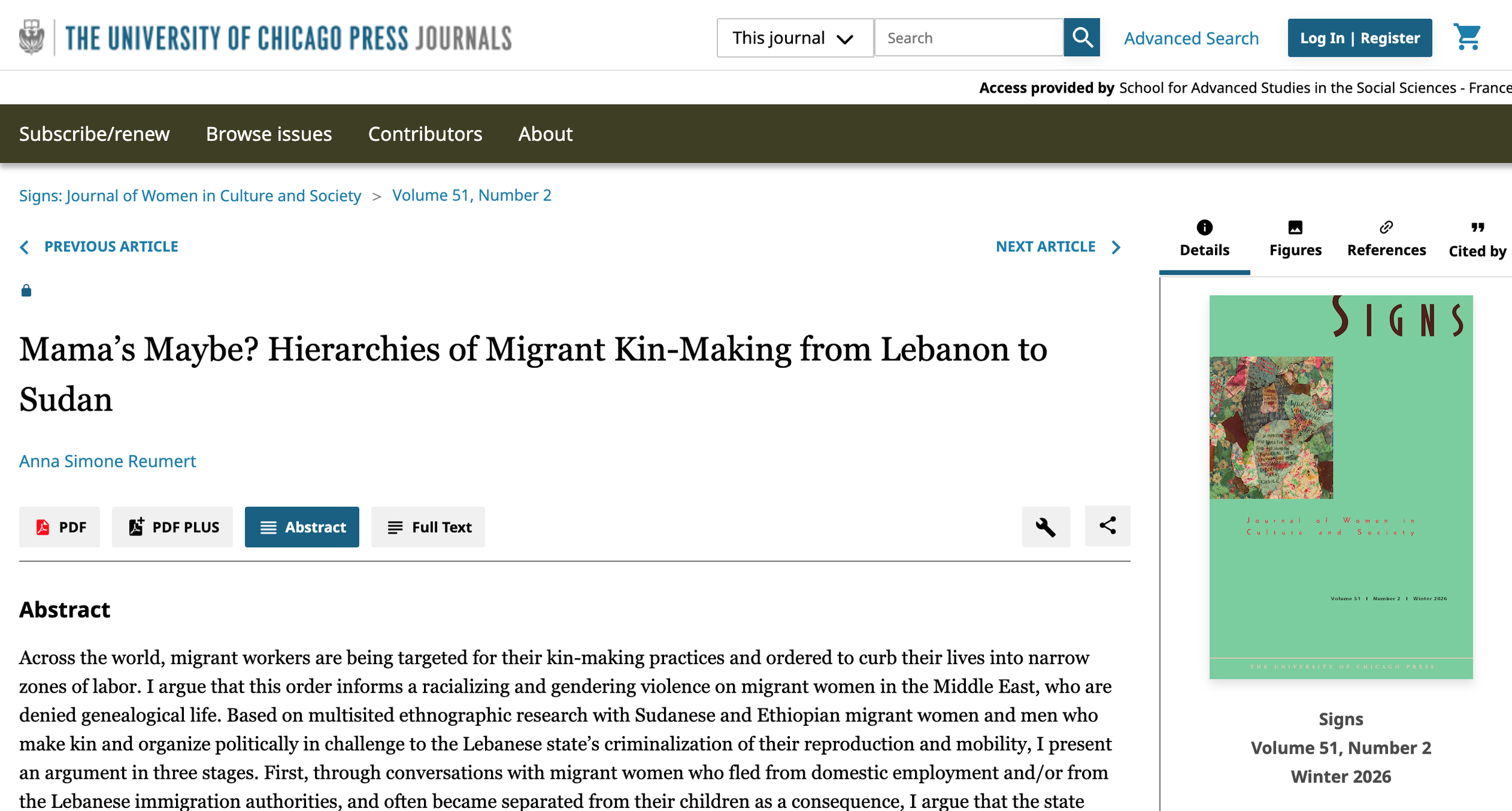 “Mama’s Maybe? Hierarchies of Migrant Kin-Making from Lebanon to Sudan”, Signs Journal vol 51, no.2, winter 2026